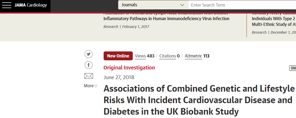 這一成果于6月27日以“Associations of Combined Genetic and Lifestyle Risks With Incident Cardiovascular Disease and Diabetes in the UK Biobank Study”為題發表在JAMA Cardiology雜志上。研究主要作者Pim van der Harst說:“我們知道基因在心血管風險中扮演角色,也知道生活方式影響心血管健康,但我們不知道這兩者是如何相互影響的。”